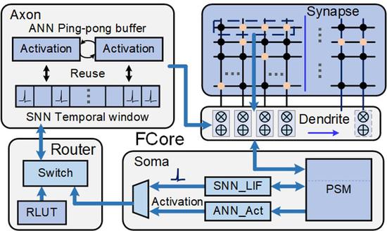 天机芯片有多个高度可重构的功能性核,可以同时支持机器学习算法和类脑电路,它由156个FCores组成,包含约40000个神经元和1000万个突触,采用28纳米工艺制程,面积为3.8×3.8平方毫米。
