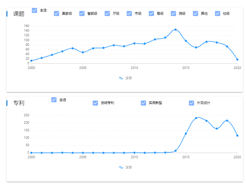 系统跨维度支持个人、科室、科研科题、论文、专利、奖项、著作、科研平台、任职等。任意时间生成各种任意个性化数据报表,包括不限于 柱状图、饼图,EXCEL等。