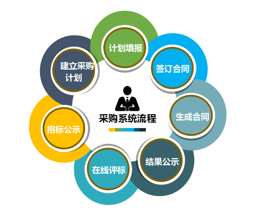 计划填报—建立采购计划—招标公示—在线评标—结果公示—生成合同—签订合同