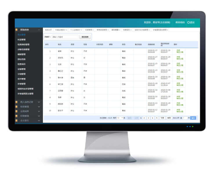 医生管理、科室管理、检查指标管理、诊断信息管理、模板管理、部位信息、检查项目、设备管理、诊室管理、诊室值班医生管理等。