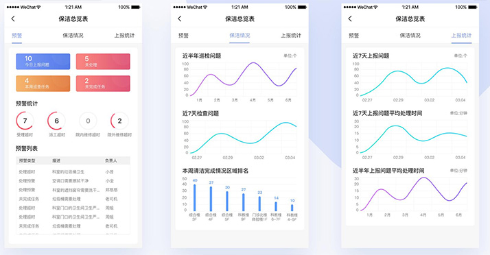 8、保洁管理:智能监督,监管保洁人员是否按规定抵达现场及完成保洁工作;加强主管巡查,提升工人服务意识;提高应急保洁响应速度,提升医院卫生质量。