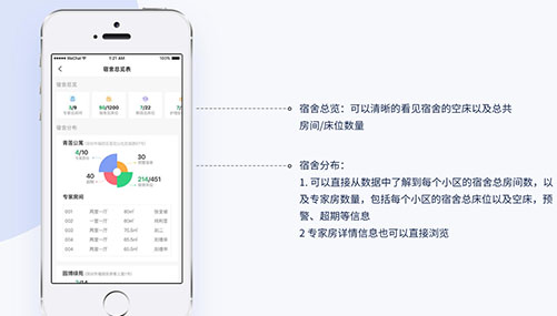 1、宿舍管理:院内宿舍及员工住房的管理,实现宿舍透明化管理、合理安排住房资源、实现宿舍分配、押金、费用缴纳等业务的规范化管理;智能计算住宿人房租、水电、燃气等费用;对退房情况进行预警,计算后面一段时间可空出房间、床位,为后续安排人员入住提供依据;实时掌握每个小区、房间、床位的入住情况。
